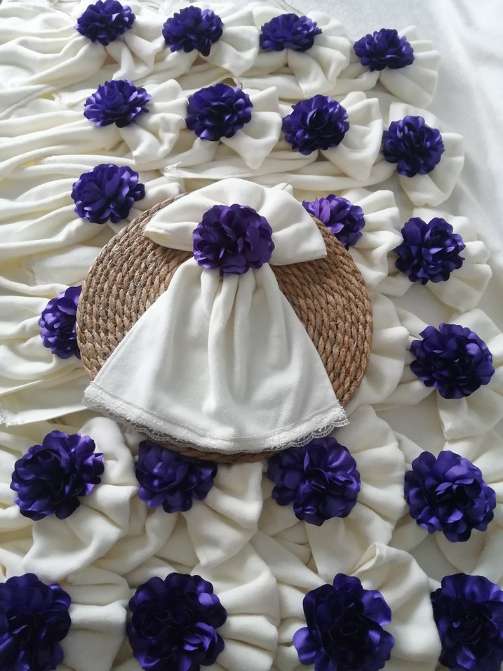 Yumuşak kumaştan, mor işlemeli çiçek desenli konvoy süsü . Üzerinde dekoratif mor çiçek detayı bulunur.