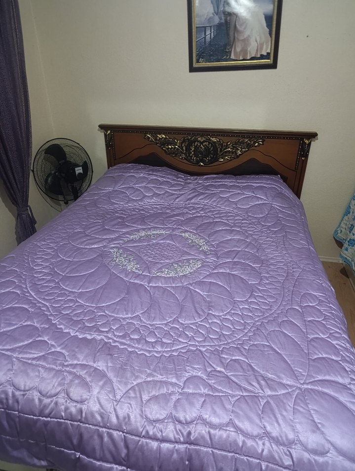 Parlak mor renkli, işlemeli desenlere sahip yatak örtüsü, yatağa doku ve zarafet katıyor. ️