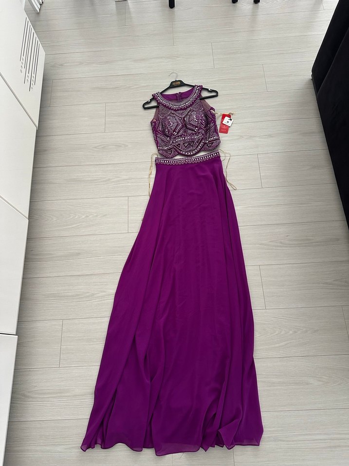 Mor renkli, straplez ve kolsuz uzun abiye elbise, işlemeli ve boncuk detaylı üst kısmı ile düğünler için uygundur. Modern klasik şıklık sunar. Beden 1 numara