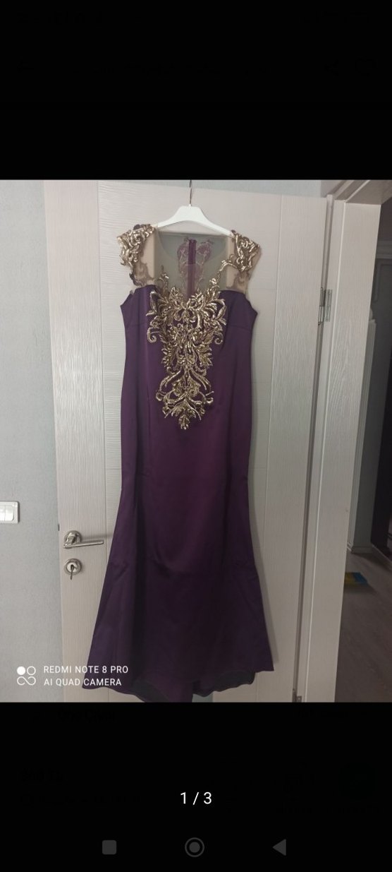 Askılı, işlemeli desenlere sahip, drapeli ve uzun mor abiye elbise. Düğün ve özel davetler için şık bir tercih. özel dikimdir 42 bedenle uyumludur