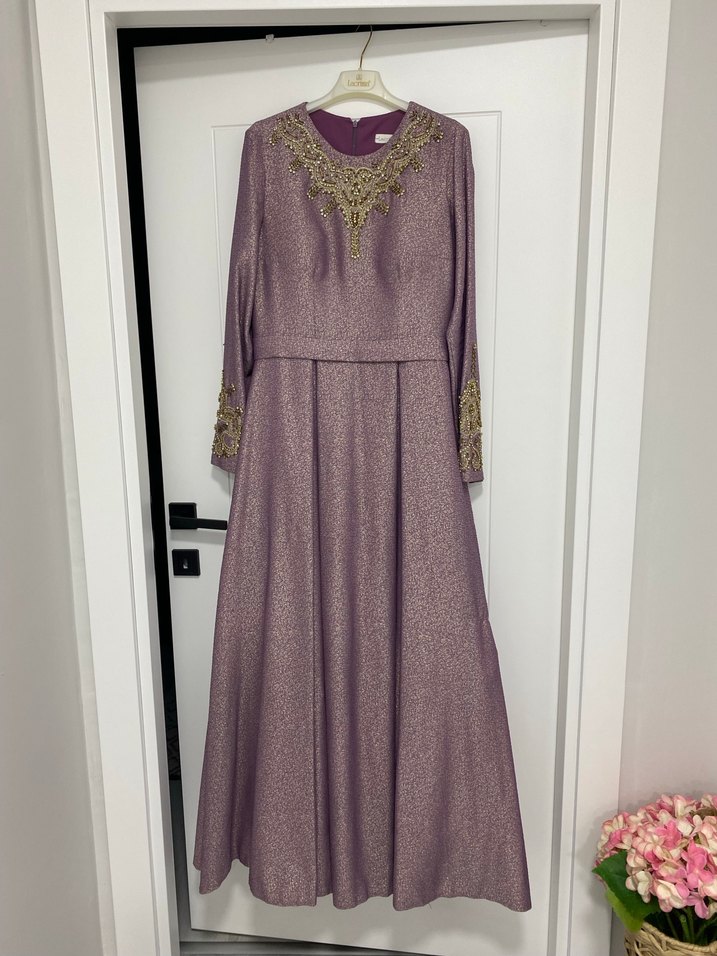 Mor işlemeli uzun abiye elbise, bol kesim ve drapeli detaylara sahip, uzun kollu ve yuvarlak yakalıdır. Parlak kumaşıyla düğünler için uygundur.