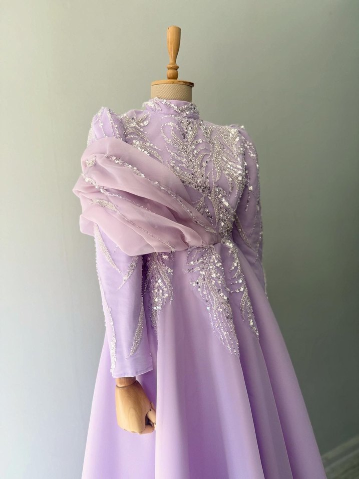 Mor İşlemeli Uzun Abiye - Yüksek Yaka, Kolsuz