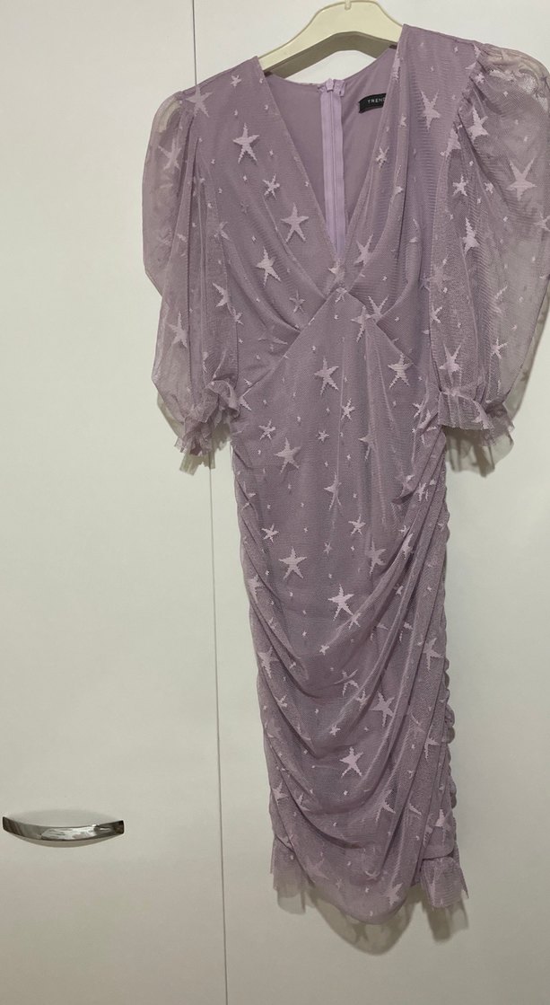 göründüğünden daha açık rengi tam lila. Pastel mor renkli, işlemeli yıldız desenli, uzun ve drapeli, V yakalı, askılı kollu, dar kesim abiye elbise. ✨
