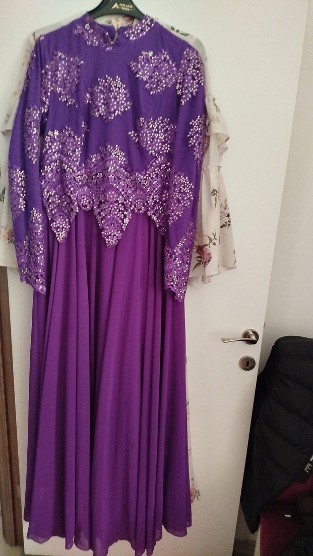 Mor renkli uzun abiye, parlak işlemeli desenlerle drapeli kumaştan yapılmıştır. Salaş kesim, uzun kollu ve straplez yakalıdır, düğünler için uygundur.