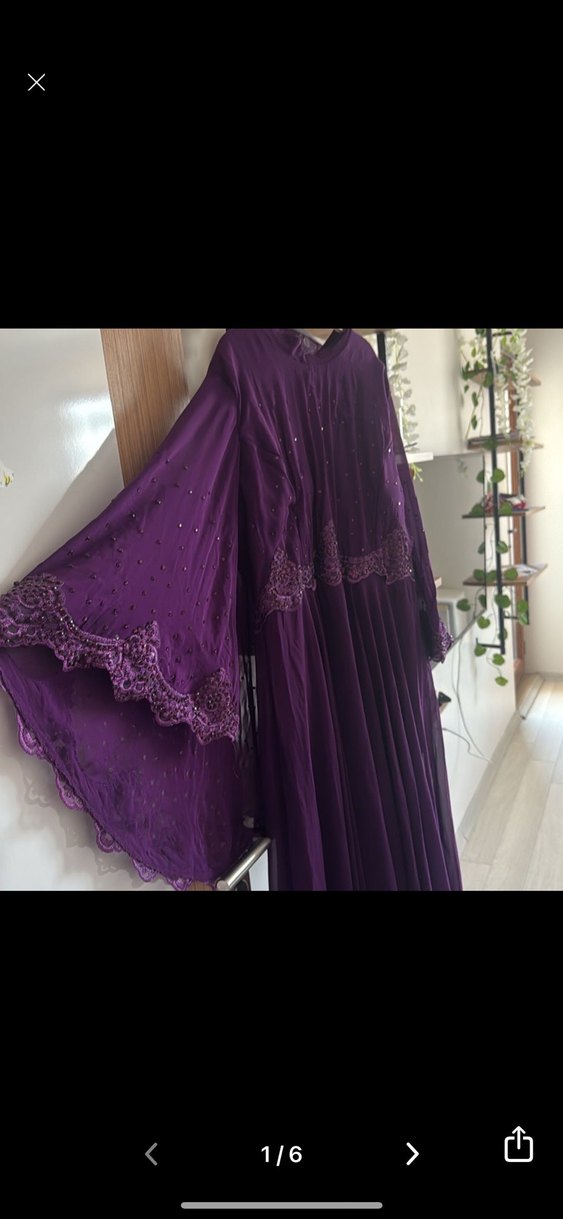 Mor işlemeli, drapeli uzun abiye, V yaka ve bol kesim ile sade ve şık bir görünüm sunar.