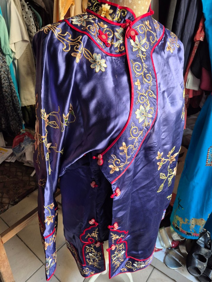 İnce işlemeli çiçek desenleriyle uzun, bol kesim mor kadın kimono. İpek gibi kumaş, yakalı ve düğmeli detaylarla vintage ve bohem tarzında.