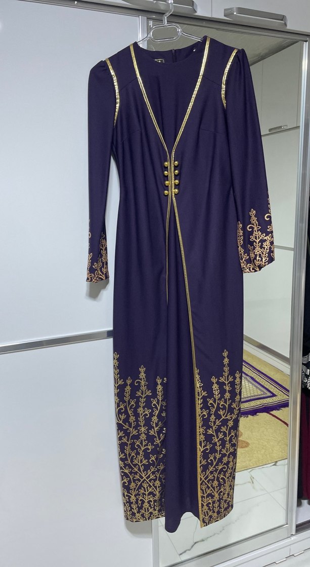 Bu mor uzun elbise, uzun kollu ve çentikli yaka detayına sahiptir. Drapeli ve altın işlemelerle süslenmiştir, düğünler için uygundur.