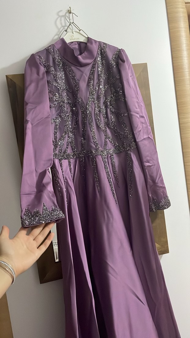 Mor İşlemeli Uzun Kollu Abiye Elbise