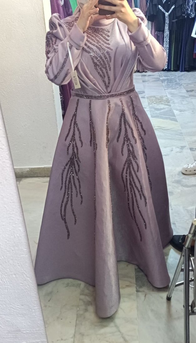 Mor İşlemeli Uzun Kollu Abiye Elbise