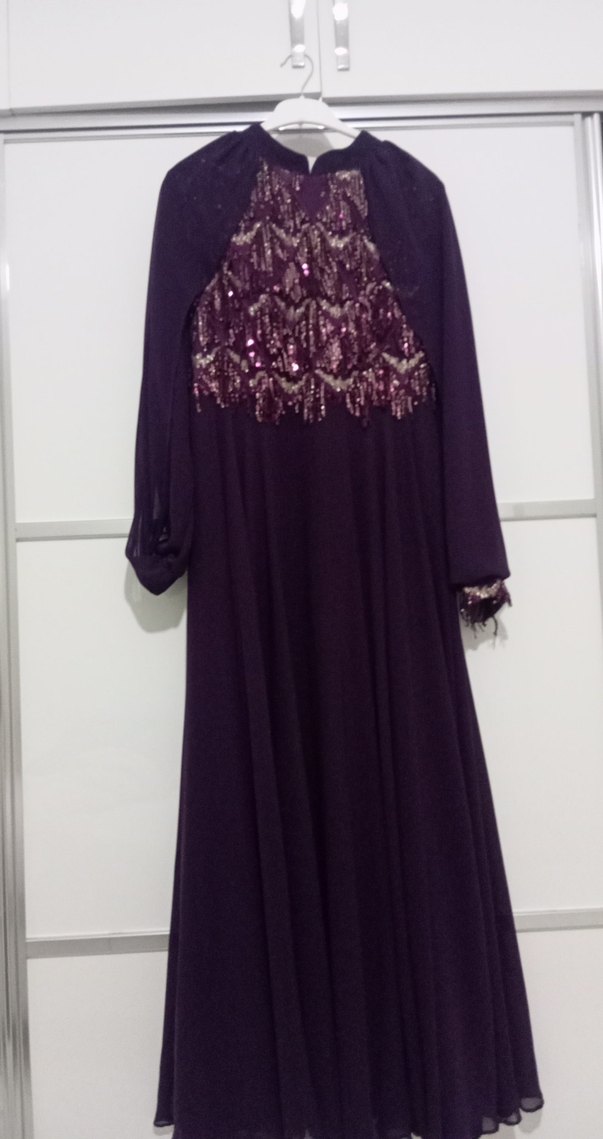Mor işlemeli, uzun kollu ve yüksek yakalı, bol kesim abiye elbise. Drapeli ve gösterişli detaylarıyla düğün için uygundur.