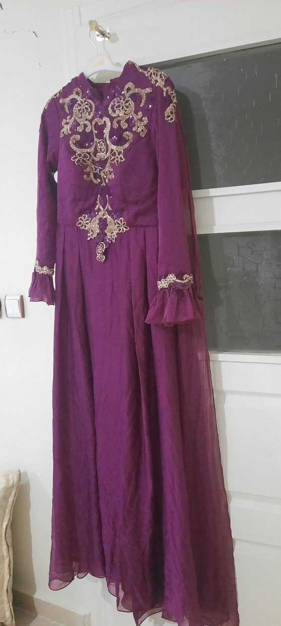 Mor renkli, uzun kollu ve yüksek yakalı bu uzun elbise, işlemeli desenlere ve drapeli detaylara sahiptir. Düğünler için uygun, bol kesim bir modeldir. ✨