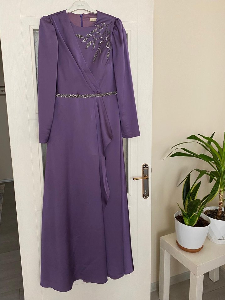 Mor İşlemeli Uzun Kollu Kadın Abiye Elbise