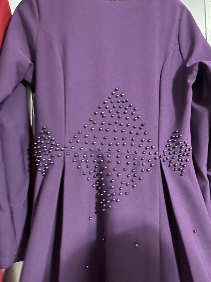 Mor renkli, uzun kollu, işlemeli ve düğmeli bu dar kesim elbise, parlak sentetik kumaştan yapılmıştır. Avant-garde stil sevenler için uygundur.