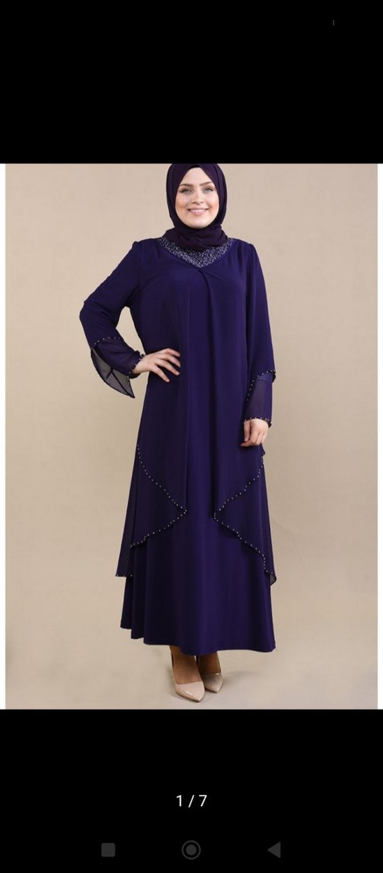 Mor renginde, işlemeli, V yaka, uzun kollu, salaş kesim, drapeli uzun tesettür elbisedir. Şık gece kullanımına uygundur.