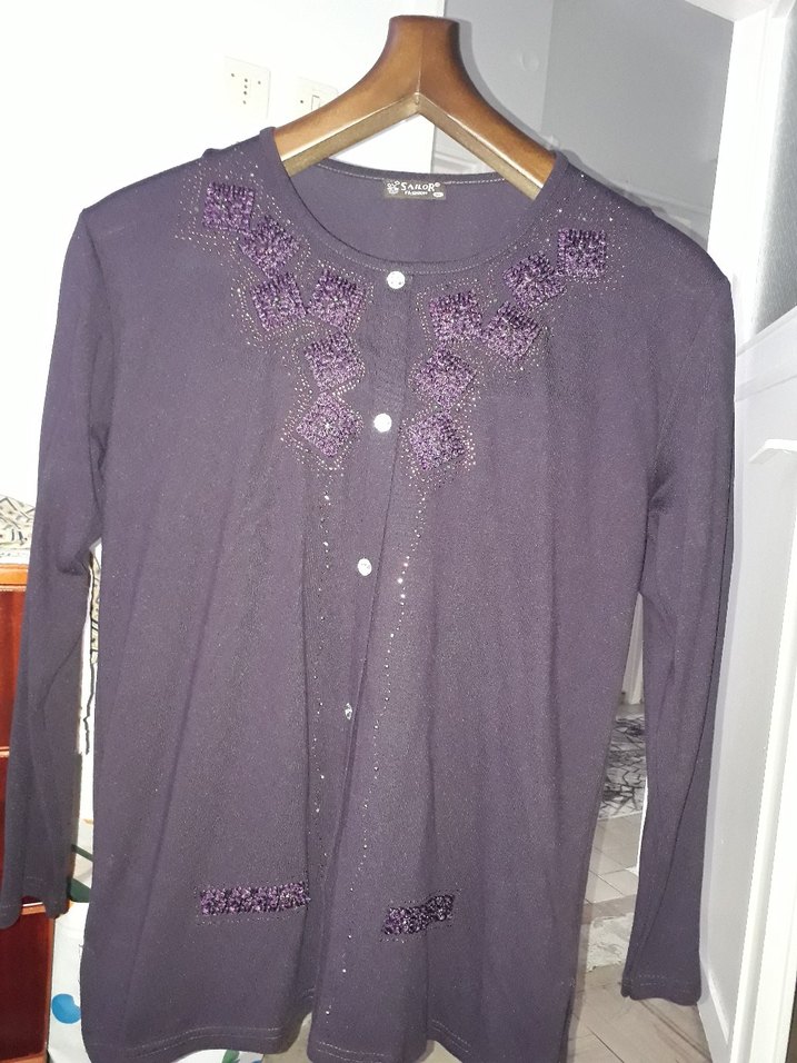 Mor renkli, triko kumaştan, uzun kollu ve yuvarlak yaka bluz. Düğmeli ve işlemeli detaylara sahip, rahat kesimle günlük kullanıma uygun.
