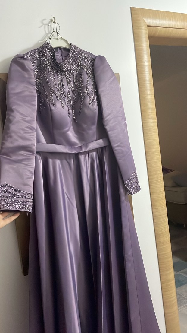 Mor, parlak kumaştan, işlemeli ve drapeli tasarıma sahip, yüksek yakalı ve uzun kollu klasik kesim uzun elbise. Düğünler için uygun, vintage esintili.