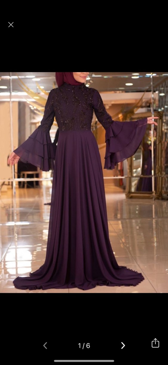 Mor işlemeli, yüksek yakalı ve uzun volanlı kollu, salaş kesim uzun abiye elbise. Düğünler için uygun, şık ve gösterişli. Bir kez kullanıldı iki saat kadar. Hiç bir sorun yok tur