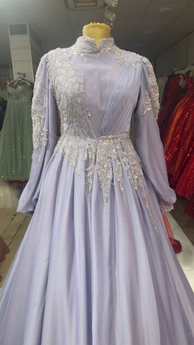 Lila renkli, V drapeli ve uzun kollu bu abiye elbise, drapeli ve işlemeli detaylara sahiptir. Düğünler için klasik ve şık bir tercihtir.
