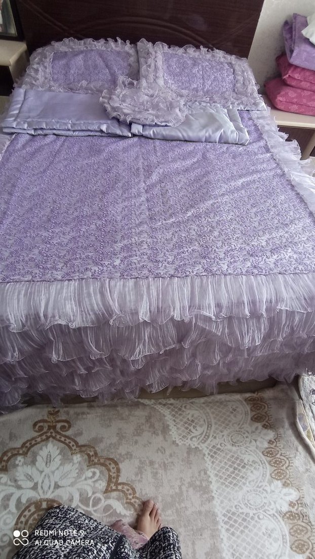 Pastel mor renkli, işlemeli ve kat kat fırfırlı yatak örtüsü, yatak odasına zarif bir dokunuş katıyor.