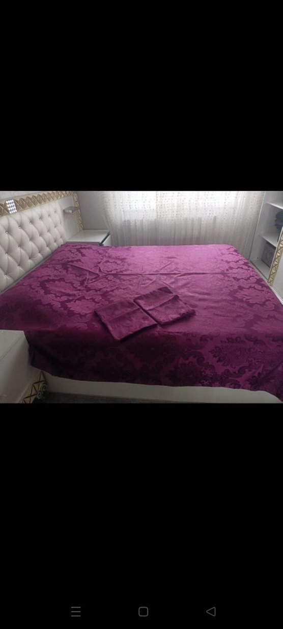 Koyu mor işlemeli desenlere sahip yatak örtüsü, odaya doku ve şıklık katıyor. Uyumu sağlayan yastık kılıfları da dahil. ️