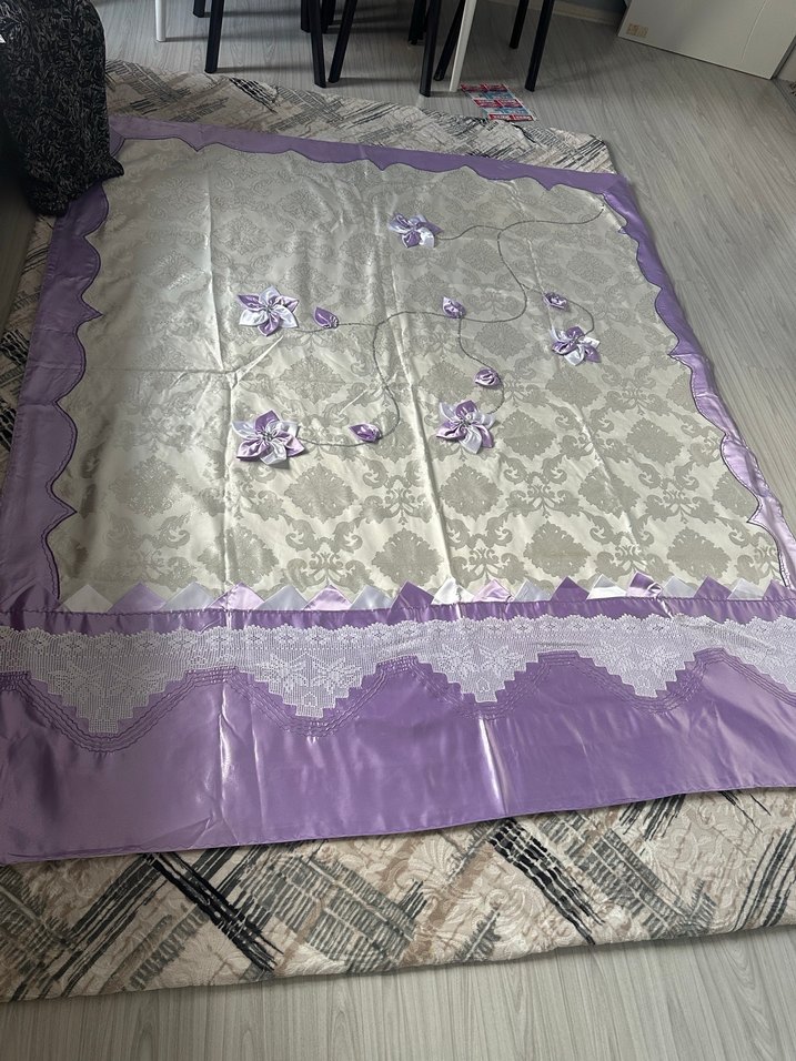 Gri zemin üzerine mor işlemeli çiçek desenleri ve dalgalı mor kenarlığı olan yatak örtüsü, yatak odasına zarif bir hava katar. İki yastık nevresim bide yatak örtüsü el emeğidir hepsi