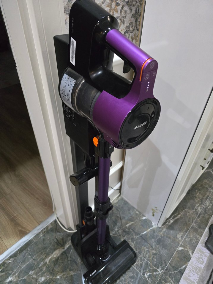 Ergonomik saplı, kolay temizlenen toz hazneli mor kablosuz dikey elektrikli süpürge. Kompakt tasarım ve çok amaçlı başlıklar içerir.