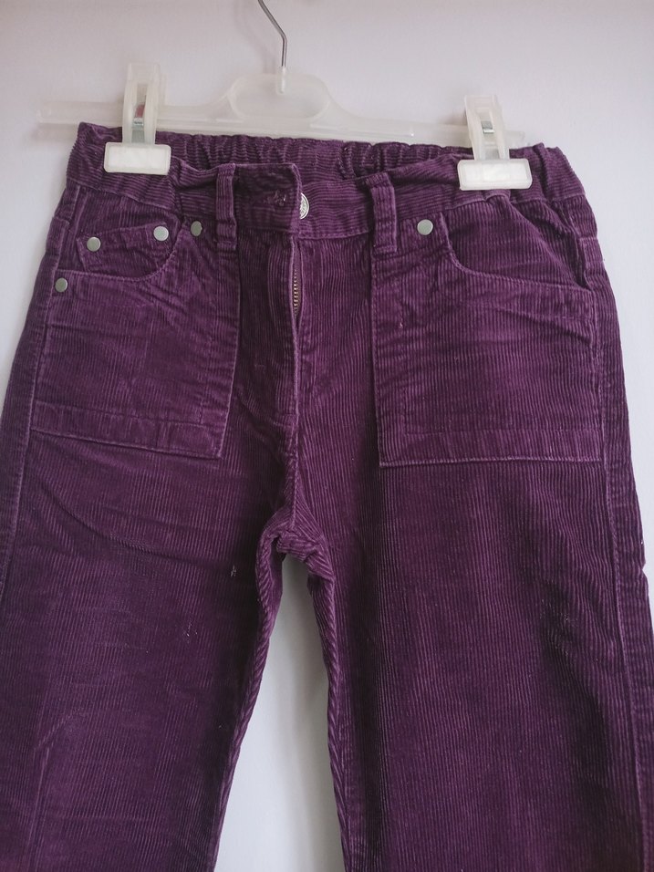 Mor kadife kumaştan, düğmeli ve cepli, bol kesim normcore tarzı kız pantolonu.
