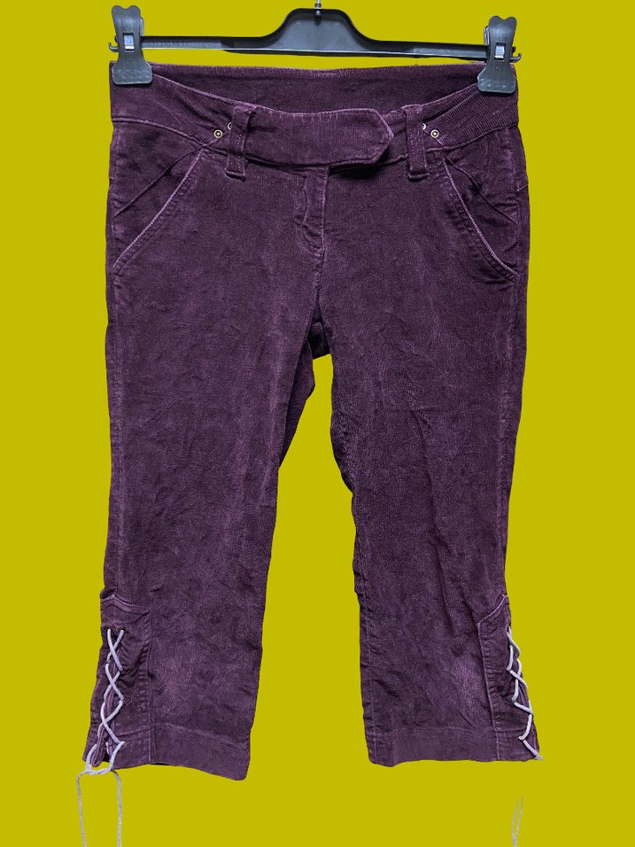 Kemerli, koyu mor süet kumaştan, bağcıklı, normal boyda, dar kesim kadın pantolonudur.