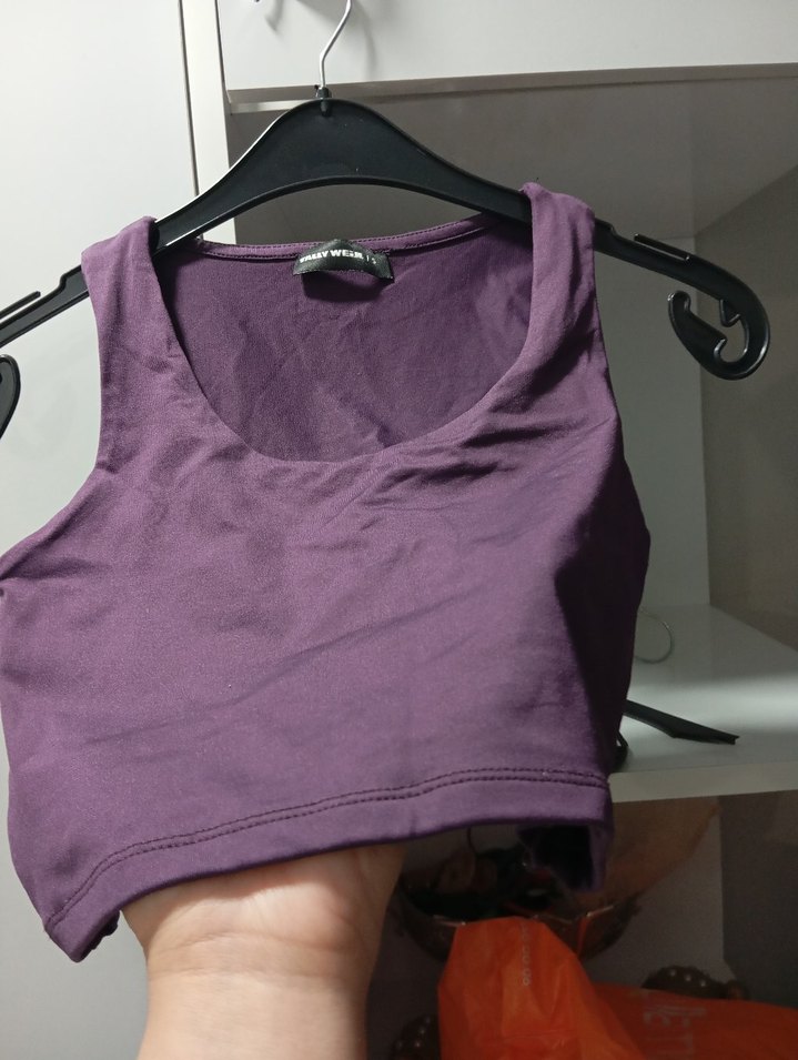 Mor renkli, bisiklet yaka ve kolsuz, vücuda oturan midi uzunluğunda kadın atlet. Spor ve günlük kullanım için uygun sentetik kumaştan yapılmıştır.
