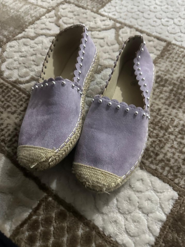 Mor süet espadriller, düğmeli ve işlemeli detaylarla günlük kullanıma uygun. hic kullanmadım sıfır ürün