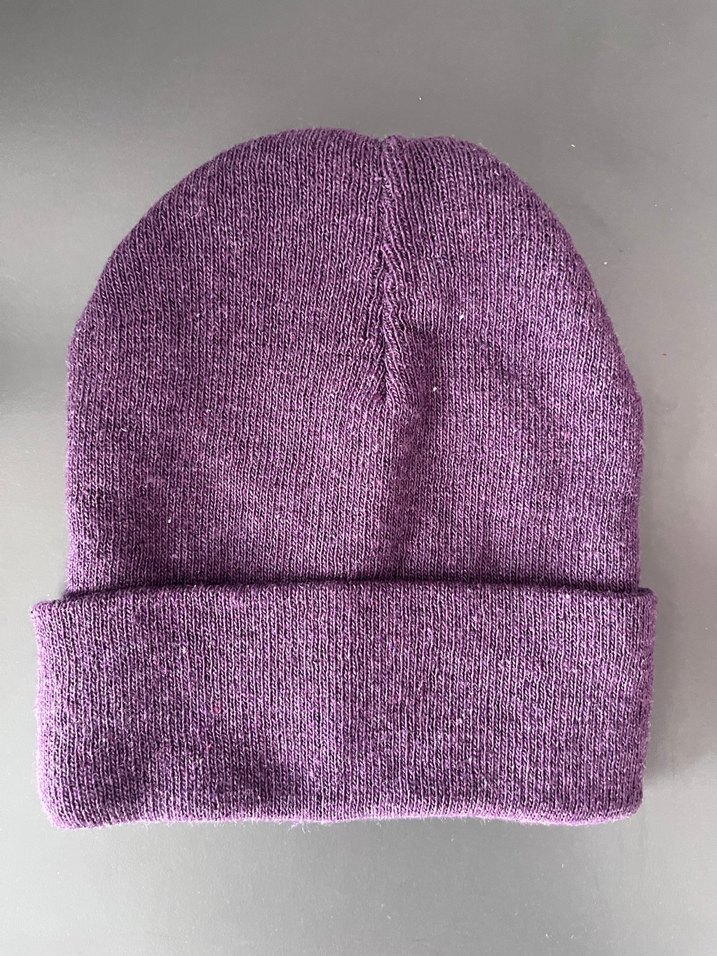Renkli mor örgü yün kadın bere, rahat ve sade bir tarz sunar, karşı kültür havası taşır.