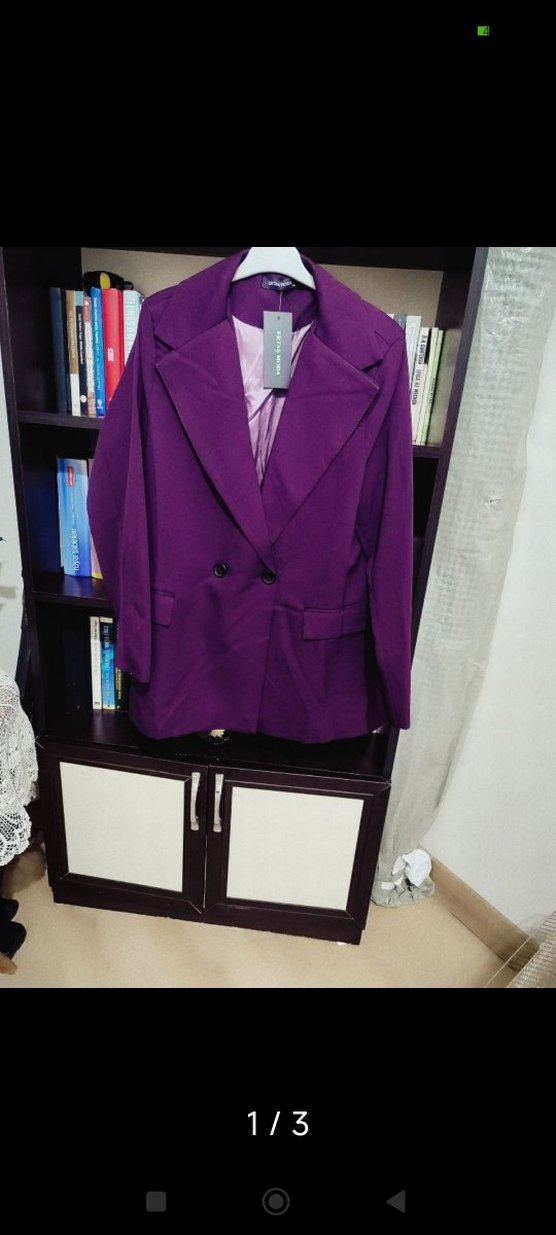 Mor renkli, düğmeli, uzun kollu kadın blazer ceket. Normal boyda, regular fit kesim ve keskin yaka detayıyla ofis için uygun.