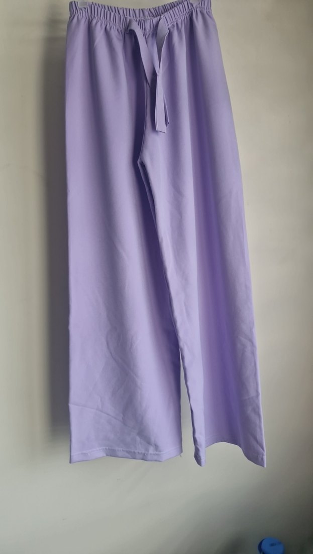 Yumuşak sentetik kumaştan, bol kesim uzun mor kumaş pantolon. Pastel tonlarda, sade tasarımlı, günlük kullanım için uygun. Zahmetsiz şıklık sunar.