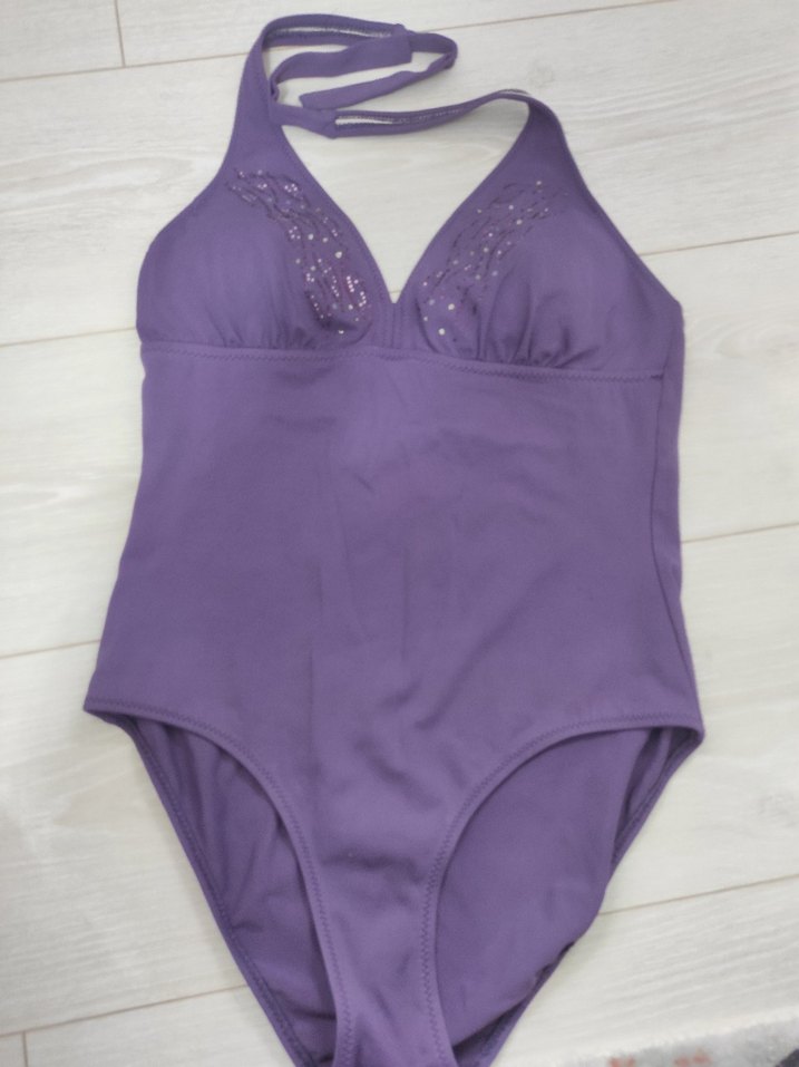 Mor renkte, boyundan baglamalı ve vücuda oturan bu mayo, göğüs kısmında zarif süslemelerle plajda şık bir görünüm sunar. ️38 bedene ıdeal olur,