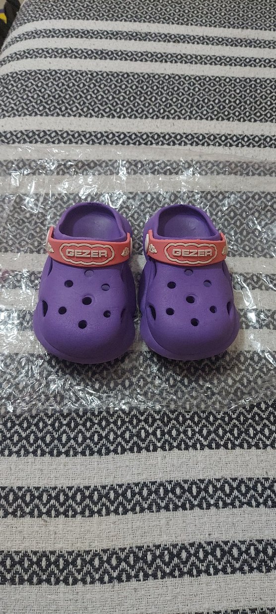 Mor kauçuk malzemeden yapılmış, renkli bağlama detaylı, ayarlanabilir velcro bantlı kız çocuk terliği. Marka: GEZER.