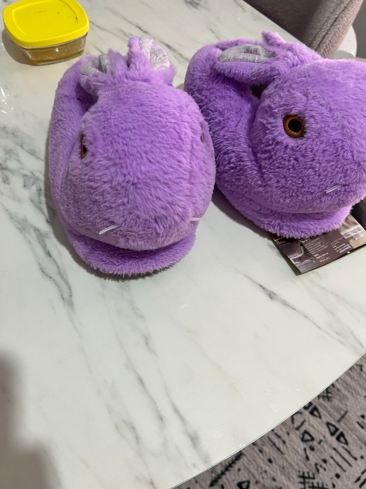 Mor, yumuşak kumaştan kız çocuk sıcak terlikleri, kolay ayarlanabilen Velcro bantlı. Sade ve renkli sokak stili tasarım.