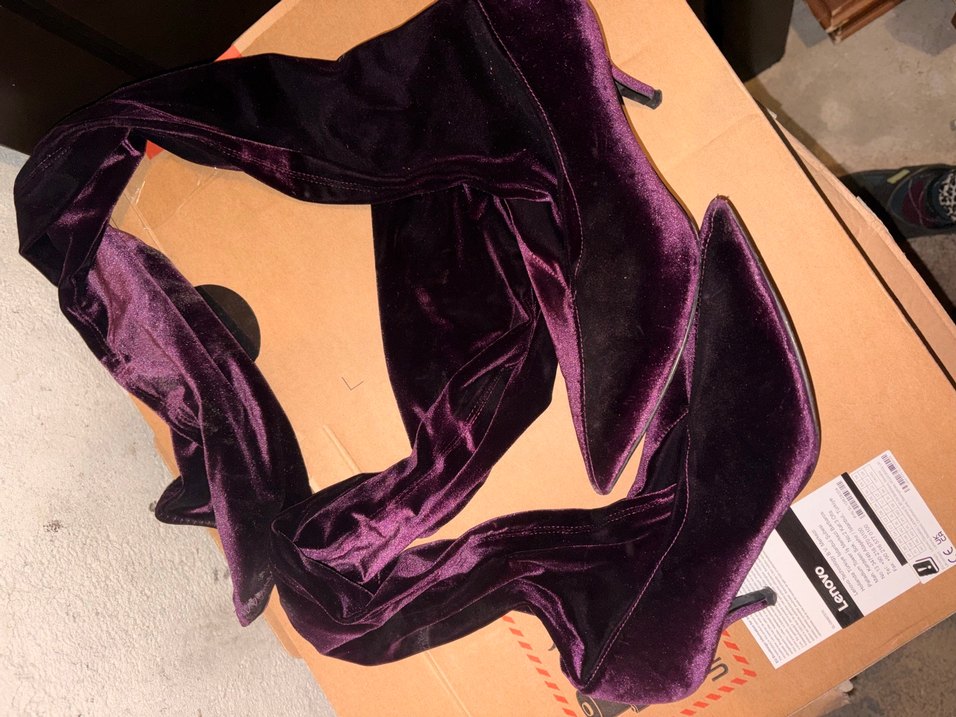 Koyu mor renkli, diz üstü, ipeksi dokulu, drapeli tasarıma sahip, ince topuklu goth tarzı botlar. Romantik buluşmalar için ideal.