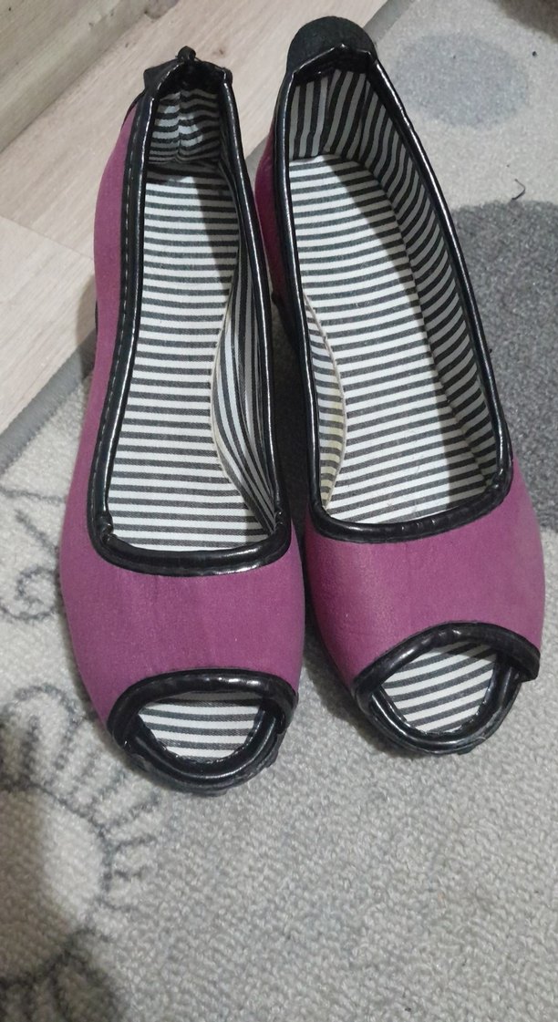 Mor renkli, dolgu topuklu ve pileli detaylı ayakkabılar. Kauçuk malzemeden yapılmış, açık burunlu ve çizgili iç astarlı, günlük kullanıma uygun.