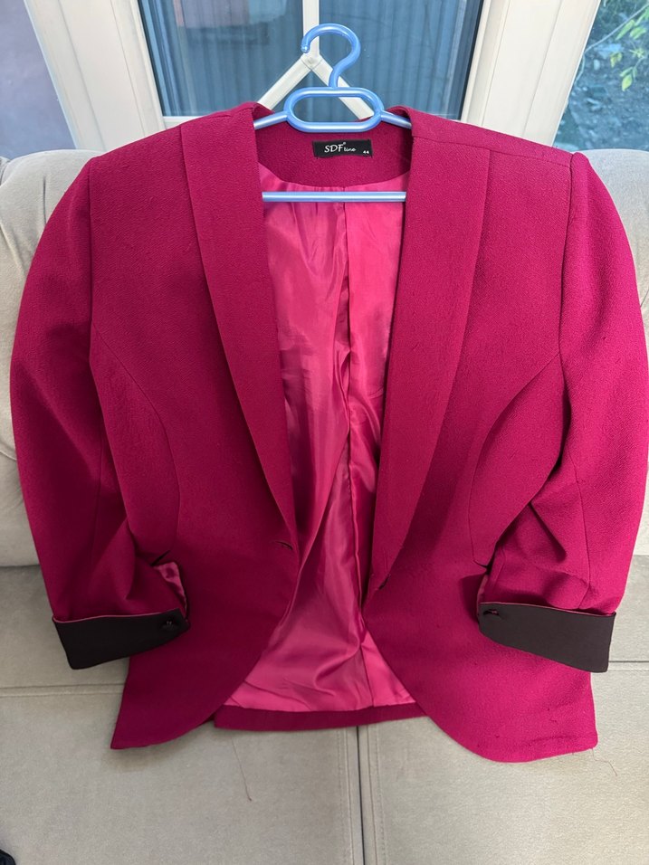 Mor, düğmeli, normal boyda kadın blazer ceket. Uzun kollu, parlak sentetik kumaştan, iş ve günlük kullanıma uygun. Belden oturmalı 44 bedendir ama 42 bedene daha uygundur.