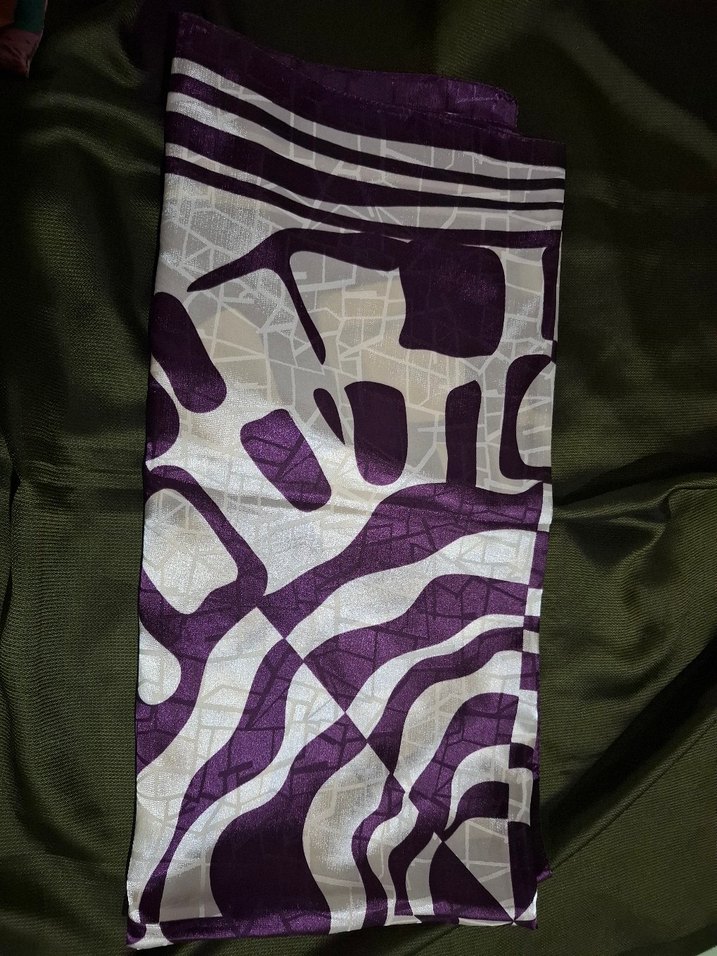 Kadınlar için, koyu mor soyut desenli, sentetik kumaştan yapılmış, drapeli ve çağdaş avant-garde tarzda fular.