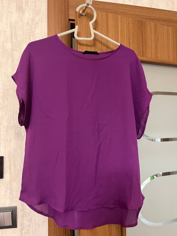 Mor renkli kadın bluz, kısa kollu ve yuvarlak yakalıdır. İpek gibi kumaştan yapılmış, salaş kesim ve normal midi boydadır. Günlük kullanıma uygundur, sade ve minimal tarzda.M-L bedene uygundur.