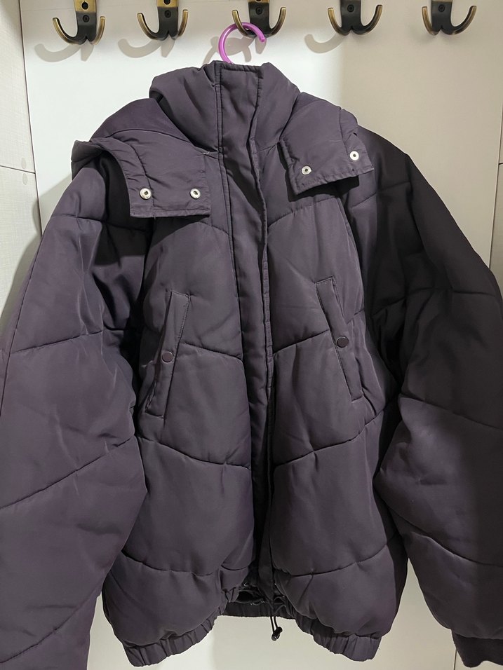 Kadın kışlık mont, fermuarlı ve düğmeli ön,yakalı ve uzun kollu. Mor renkte(patlıcan moru), rahat kesim, midi boy ve yumuşak, sıcak kumaştan yapılmıştır. Çok az kullanıldı bir kış.