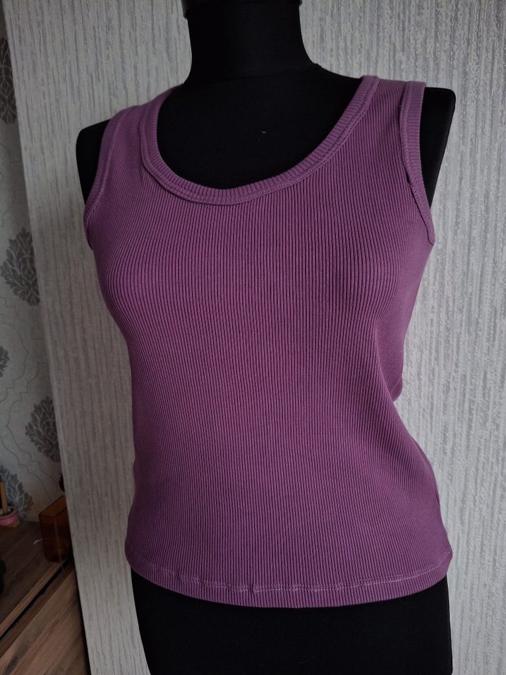 Mor kolsuz kadın atlet, fitted kesim ve yuvarlak yaka ile normal boyda, yumusak kumaştan günlük kullanım için uygun.