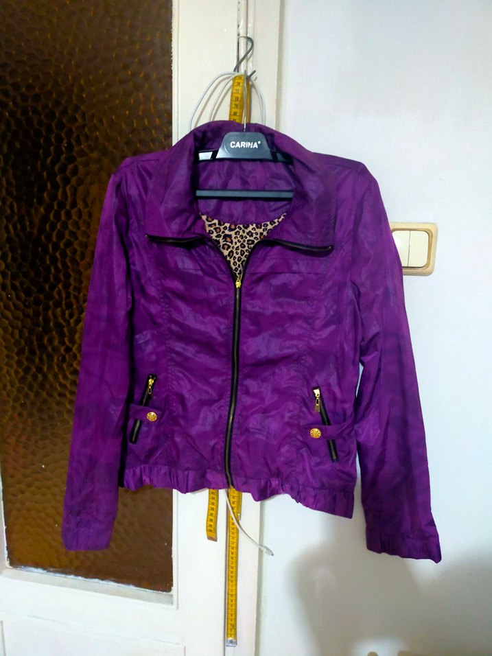 Mor süet kadın ceketi, yaka kısmı kesik ve fermuarlı. Dar kesim, askılı kollar ve parlak batik deseniyle günlük sokak tarzına uygun.