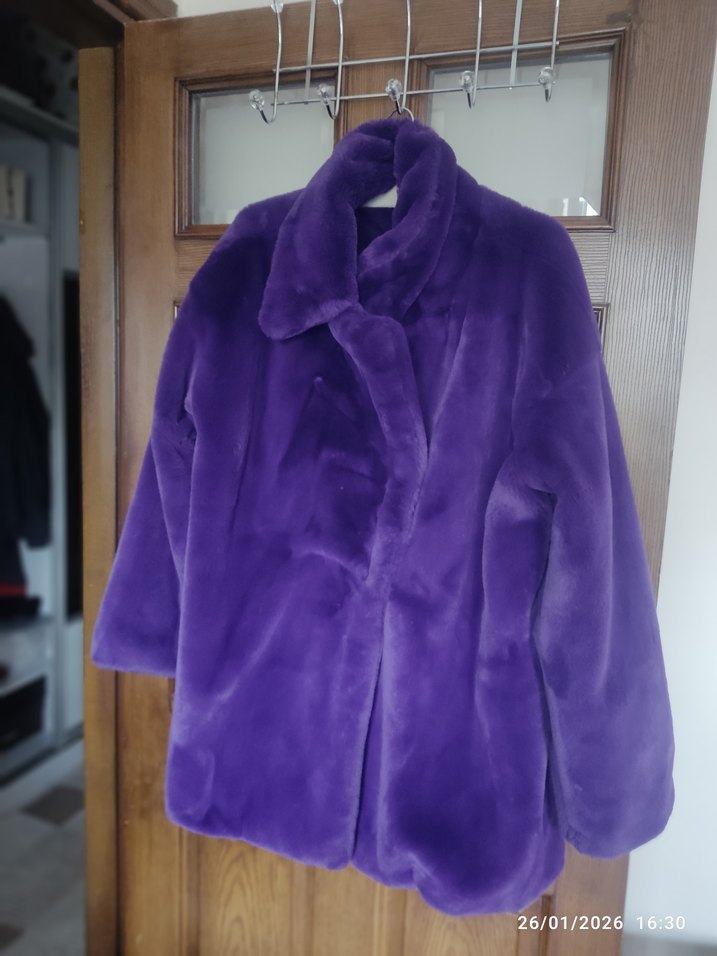 Mor, yumuşak kumaştan, uzun kollu, kesik yakalı, midi boy bol kesim kadın kürk mont. Rahat ve şık bir sokak stili sunar.