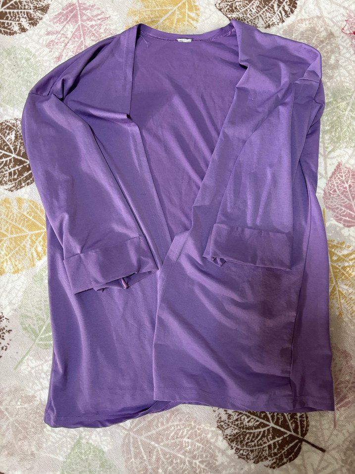 Mor renkli, parlak kumaştan yapılmış, uzun kollu ve midi boyda salaş kesim kadın ceket. Minimalist ve desen içermeyen sokak tarzına uygun.