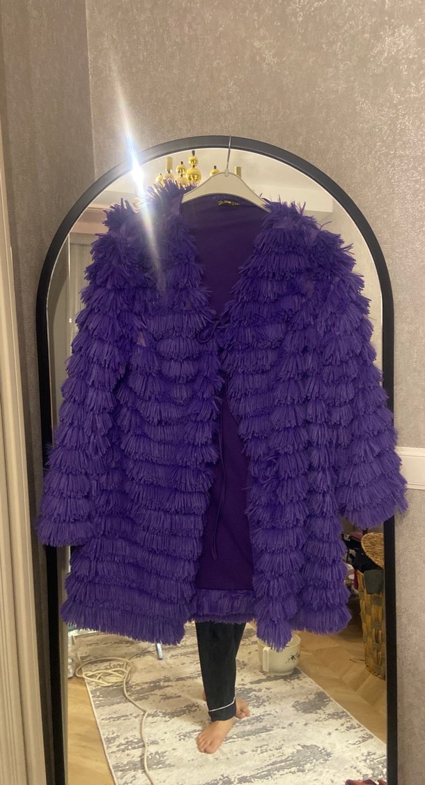 Mor midi boy suni kürk, uzun kollu ve bol kesimdir. Yaka detayında kesik bulunur, rahat ve bohem tarzda, parti için uygundur.
