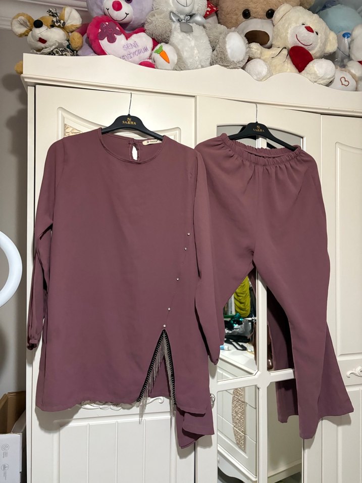 Mor renkli, uzun kollu, midi uzunlukta, bol kesim kadın takımı. İpek gibi dokusu ve drapeli tasarımıyla günlük kullanıma uygundur. Pantolon lastikli bel, üstte yırtmaç detayları bulunur.