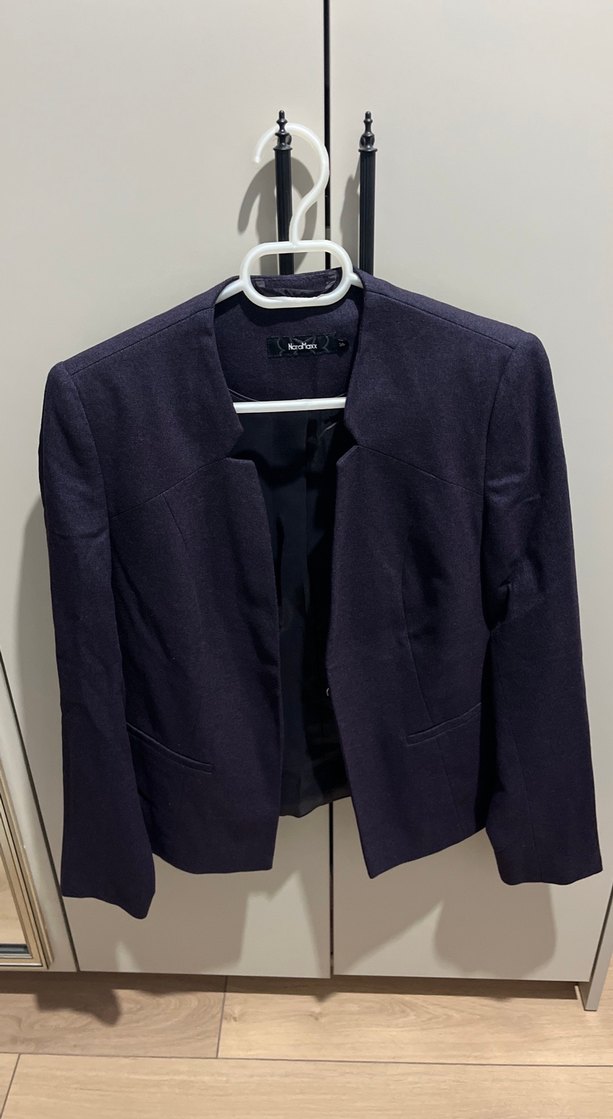 Mor renkte, düğmeli ve uzun kollu kadın ofis blazeri. Normal kesim ve midi boyda, sentetik kumaştan, desen içermeyen sade tasarım.