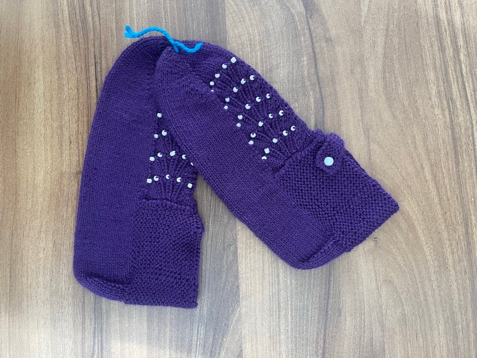 Koyu mor renkli, küçük boncuk detaylı, kadknlar için sade ve örgü patik Bohem tarzda, düz ve kullanışlı. Beş şiş ile işlenmiştir